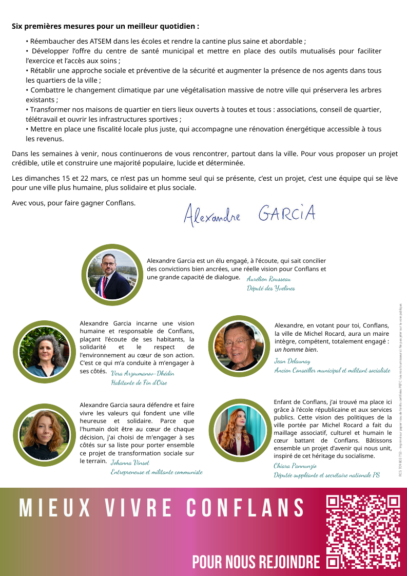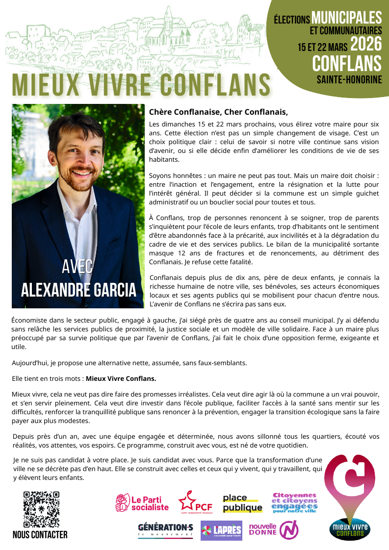 À Conflans, trop de personnes renoncent à se soigner, trop de parents s’inquiètent pour l’école de leurs enfants, trop d’habitants ont le sentiment d’être abandonnés face à la précarité, aux incivilités et à la dégradation du cadre de vie et des services publics. Le bilan de la municipalité sortante masque 12 ans de fractures et de renoncements, au détriment des Conflanais. Je refuse cette fatalité. Les dimanches 15 et 22 mars prochains, vous élirez votre maire pour six ans. Cette élection n’est pas un simple changement de visage. C’est un choix politique clair : celui de savoir si notre ville continue sans vision d’avenir, ou si elle décide enfin d’améliorer les conditions de vie de ses habitants. Soyons honnêtes : un maire ne peut pas tout. Mais un maire doit choisir : entre l’inaction et l’engagement, entre la résignation et la lutte pour l’intérêt général. Il peut décider si la commune est un simple guichet administratif ou un bouclier social pour toutes et tous. Économiste dans le secteur public, engagé à gauche, j’ai siégé près de quatre ans au conseil municipal. J’y ai défendu sans relâche les services publics de proximité, la justice sociale et un modèle de ville solidaire. Face à un maire plus préoccupé par sa survie politique que par l’avenir de Conflans, j’ai fait le choix d’une opposition ferme, exigeante et utile. Aujourd’hui, je propose une alternative nette, assumée, sans faux-semblants. Elle tient en trois mots : Mieux Vivre Conflans. Mieux vivre, cela ne veut pas dire faire des promesses irréalistes. Cela veut dire agir là où la commune a un vrai pouvoir, et s’en servir pleinement. Cela veut dire investir dans l’école publique, faciliter l’accès à la santé sans mentir sur les difficultés, renforcer la tranquillité publique sans renoncer à la prévention, engager la transition écologique sans la faire payer aux plus modestes. Nous contacter Chère Conflanaise, Cher Conflanais, Conflanais depuis plus de dix ans, père de deux enfants, je connais la richesse humaine de notre ville, ses bénévoles, ses acteurs économiques locaux et ses agents publics qui se mobilisent pour chacun d’entre nous. L’avenir de Conflans ne s’écrira pas sans eux. Depuis près d’un an, avec une équipe engagée et déterminée, nous avons sillonné tous les quartiers, écouté vos réalités, vos attentes, vos espoirs. Ce programme, construit avec vous, est né de votre quotidien. Je ne suis pas candidat à votre place. Je suis candidat avec vous. Parce que la transformation d’une ville ne se décrète pas d’en haut. Elle se construit avec celles et ceux qui y vivent, qui y travaillent, qui y élèvent leurs enfants.